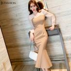 パーティードレス 異素材切替 マーメイドワンピース ロング丈 ミモレ丈 ロングドレス 長袖 きれいめ JSfashion