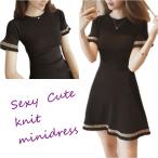 ミニワンピース 韓国 半袖 Aライン 刺繍 フリンジ サマーニット ミニ丈 ラウンドネック タイト スリムワンピ ブラック