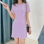 ミニワンピース 無地ワンピース 半袖 サマーワンピース ラウンドネック ミドル丈 パープル 紫