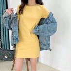 ミニワンピース 無地ワンピース 半袖 サマーワンピース ラウンドネック ミドル丈 イエロー 黄色