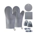 シリコン ミトン 鍋つかみ 鍋敷き 8点セット 耐熱 グローブ 滑止め 防水 キッチン オーブンレンジ バーベキュー ロング グレー plusgree