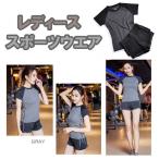 スポーツウェア レディース グレー トレーニング ジム ヨガ スパッツ一体型 速乾 伸縮 上下 2点セット 半袖 ショートパンツ