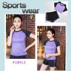 スポーツウェア レディース パープル トレーニング ジム ヨガ 上下 2点セット スパッツ一体型 半袖 ショートパンツ 速乾 伸縮