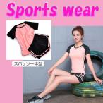 スポーツウェア レディース トレーニング ジム 上下2点セット 速乾 スパッツ一体型 半袖 ショートパンツ 可愛い ビビットピンク