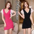 セクシー ボディコン ワンピ キャバ ドレス コスプレ 衣装 胸元ディープVネック&袖レース切替セクシーミニドレス S M L 2L 3L 4L サイズ セール